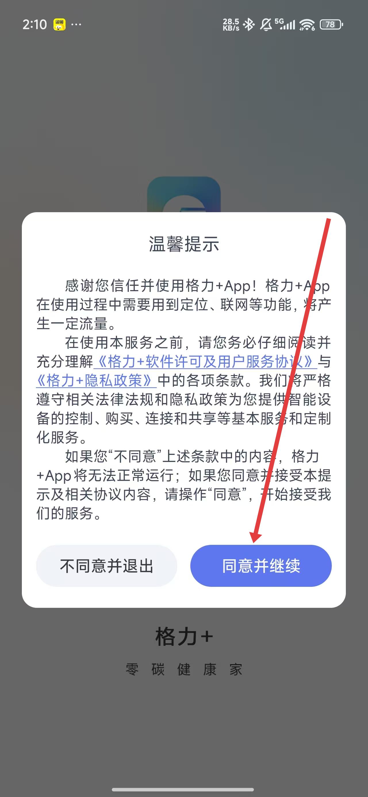 1、在打开格力app后,点击弹窗中同意并继续按钮,进入使用。