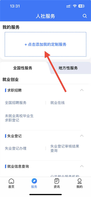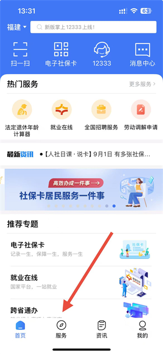 1、打开掌上12333app,点击底部导航栏中的服务选项。