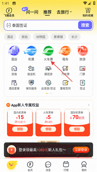 1、进入飞猪,在首页点击火车票,进入火车票预订页面。