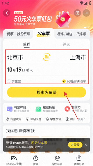 2、在火车票预订页面,选择好信息后,点击搜索火车票,进入车次列表页面。