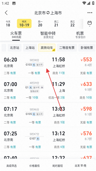3、在车次列表页面,选择心仪的车次,进入该车次座位选择页面。