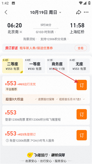 4、在座位选择页面,选择想要的座位类型,点击订,进入乘客添加页面。