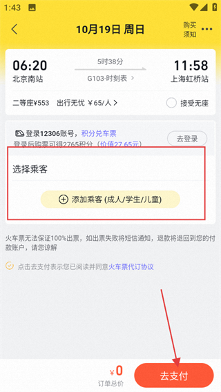 5、在乘客添加页面,添加乘客后,点击去支付,完成高铁票购买流程。