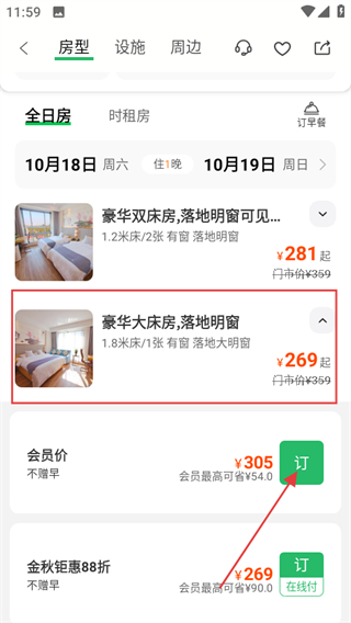 3、在酒店房型页面,选择想要的房型,如豪华大床房落地明窗,点击订,进入登录页面。