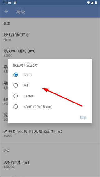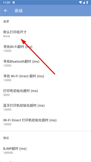 3、在高级设置页面,点击默认打印纸尺寸选项。
