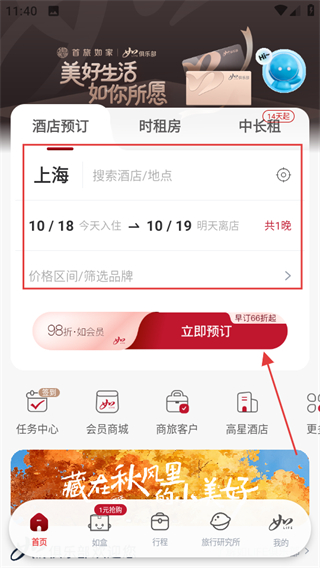 1、进入首旅如家,在首页的酒店预订板块,设置好信息后,点击立即预订,进入酒店推荐页面。