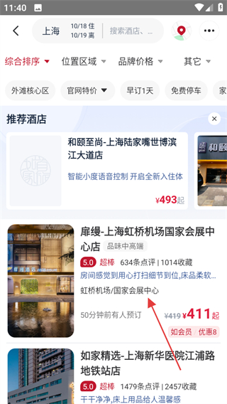 2、在酒店推荐页面,选择心仪的酒店,如扉缦上海虹桥机场国家会展中心店,进入该酒店详情页面。