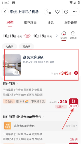 3、在酒店详情页面,选择想要的房型,如商务大床房A,点击订,进入预订流程。