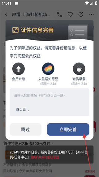 4、预订时,若需完善证件信息点击立即完善,完成完善信息后即可成功预订酒店。