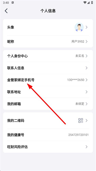3、在个人信息页面,点击金管家绑定手机号选项,进入金管家账号页面。