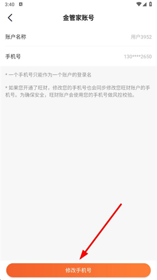 4、在金管家账号页面,点击修改手机号按钮,按照提示完成手机号修改操作。