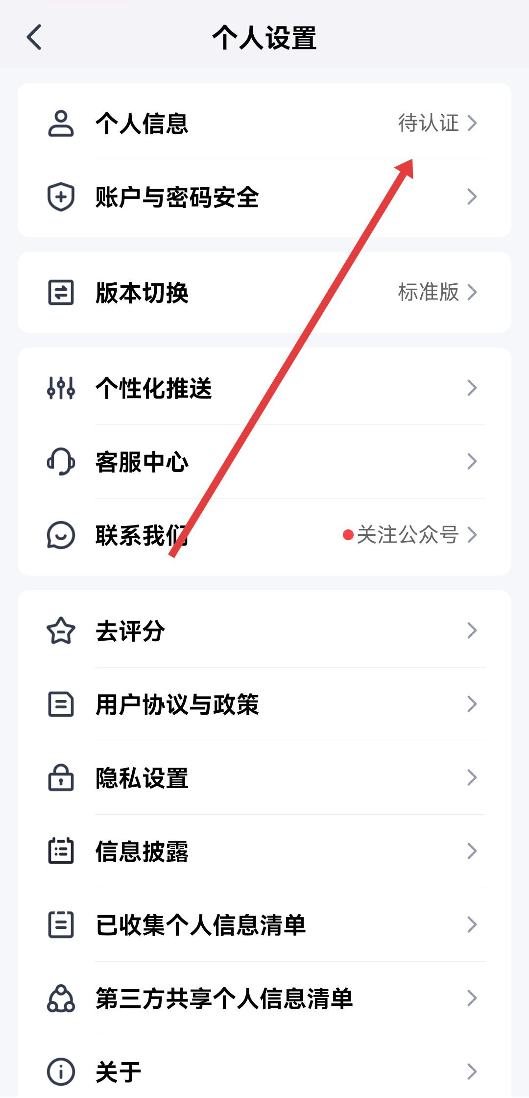 1、进入平安金管家APP的个人设置页面,点击个人信息选项右侧显示待认证,进入个人信息的界面。
