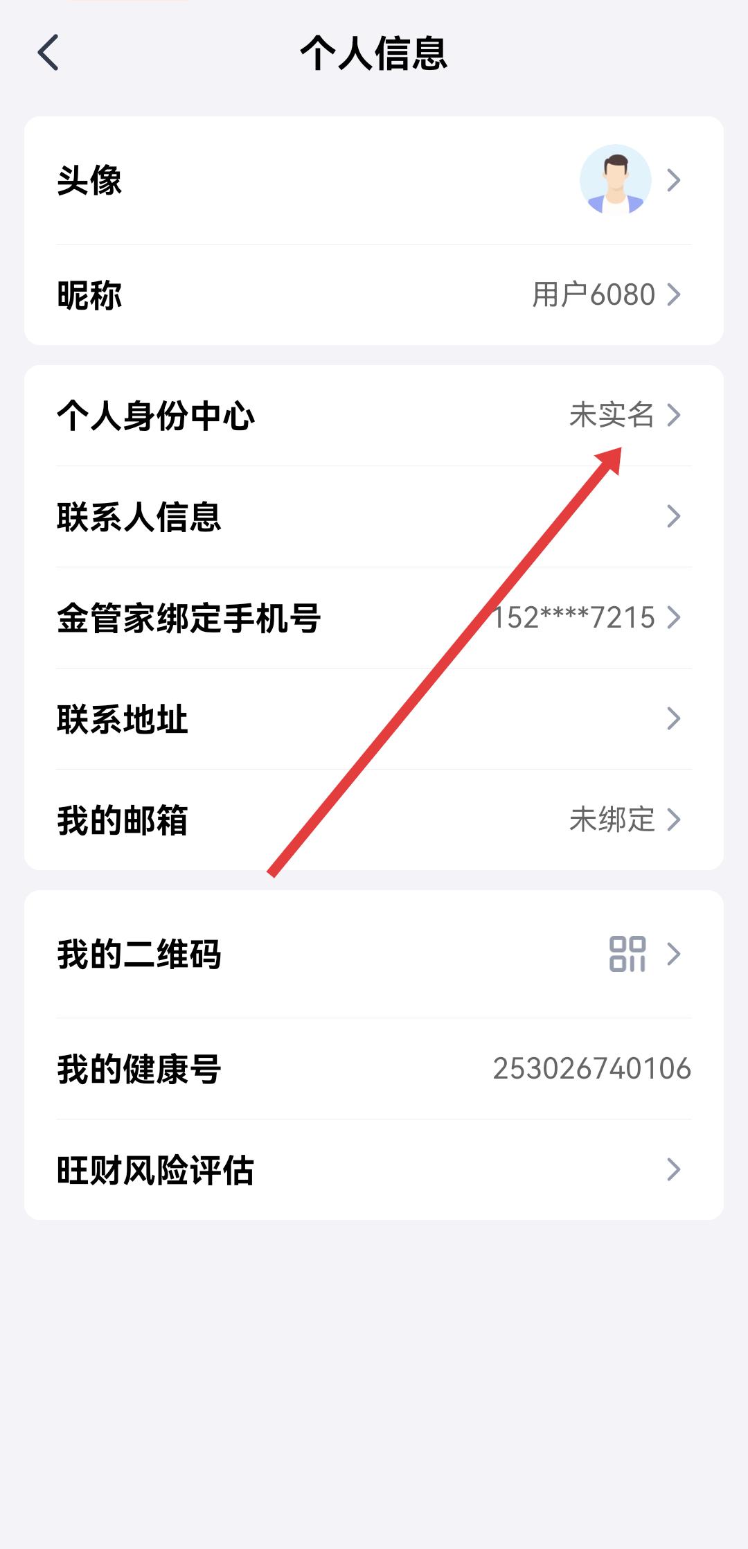2、在个人信息的页面,点击个人身份中心选项,右侧显示未实名,会触发未实名提醒的弹窗。
