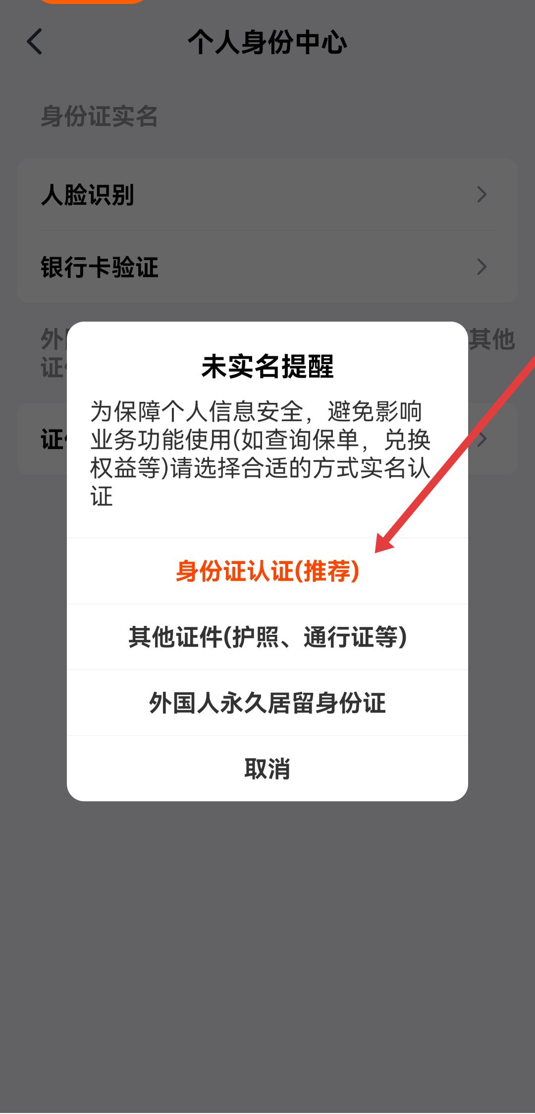 3、在弹出的未实名提醒弹窗中,点击身份证认证按钮,按系统指引提交身份证信息,完成实名认证。