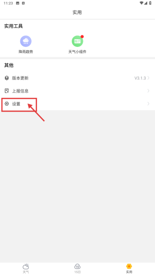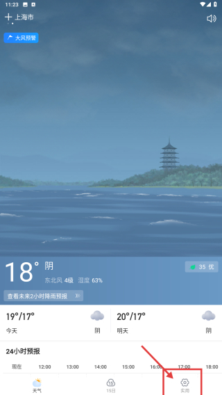 1、打开天气类应用,点击底部实用选项,进入实用板块。