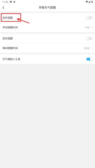 4、在早晚天气提醒页面,找到定时提醒功能,可根据需求开启或设置早间、晚间提醒时间。