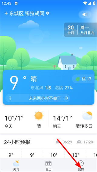 1、在天气APP主页面,点击右下角我的,进入个人页面。
