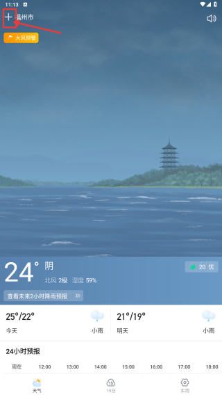 1、打开天气类应用,点击左上角城市管理图标,进入城市管理页面。