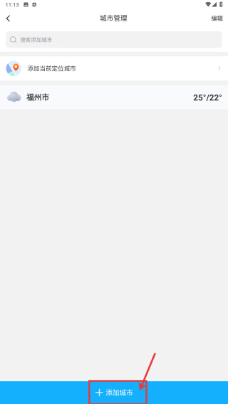 2、在城市管理页面,点击添加城市按钮,进入城市选择界面。
