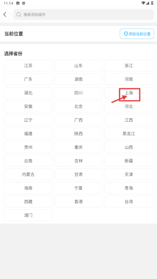 3、在城市选择界面,点击上海选项,添加上海市天气信息。