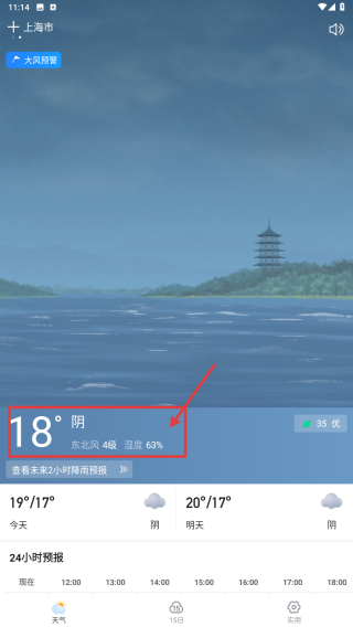 4、添加完成后,查看上海市的天气信息,当前温度为18°,天气阴,东北风4级,湿度63%。