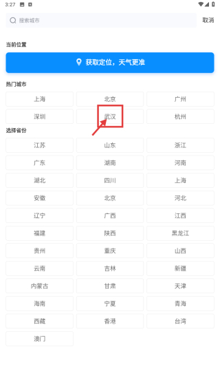 3、在添加城市界面,选择武汉作为要添加的城市。