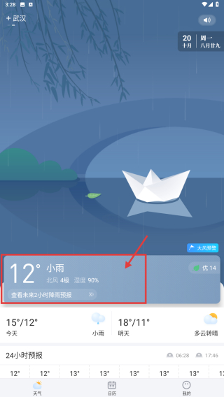 4、添加完成后,查看武汉市的天气信息,当前温度为12°,天气小雨,北风4级,湿度90%。