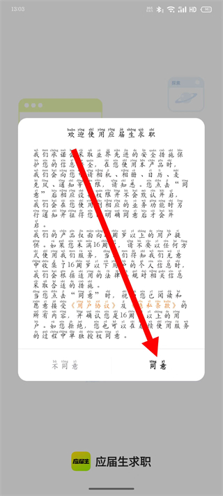 1、打开应届生求职,在弹出的使用提示弹窗中点击同意。