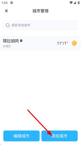 2、在城市管理页面,点击添加城市,进入城市选择页面。