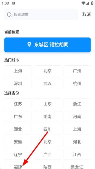 3、在城市选择页面,选择想要查看天气的城市,如福建相关城市。