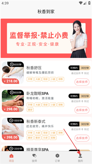 1、进入秋香到家,在项目页面,点击底部我的,进入个人页面。
