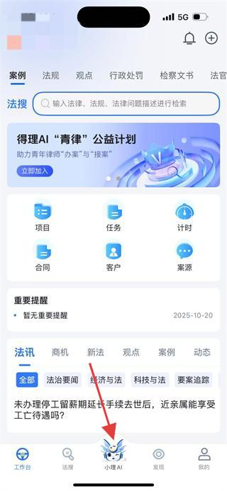 1、进入得理法搜,在工作台页面点击底部小理AI,进入小理AI页面。