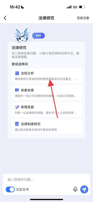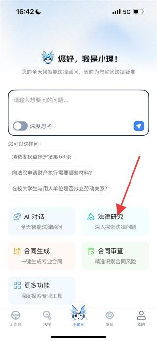 2、在小理AI页面,点击法律研究,进入法律研究页面。