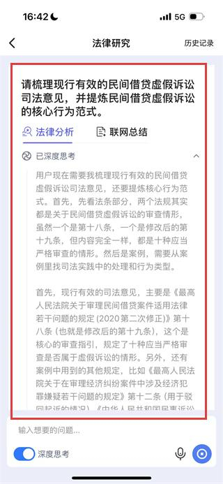 4、在内容分析页面,即可查看相关法律分析和联网总结等内容。