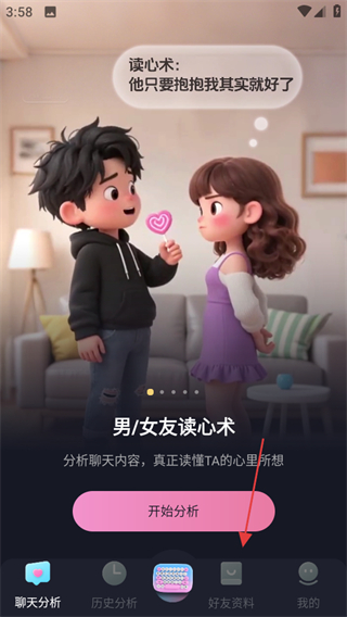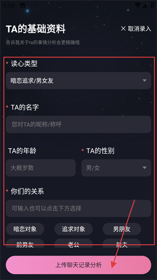3、在好友资料录入页面,填写信息后,点击上传聊天记录分析,即可进行相关分析。