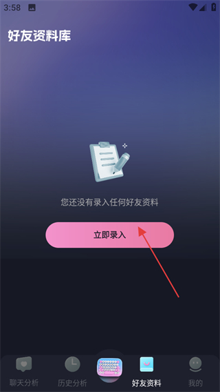 2、在好友资料库页面,点击立即录入,进入好友资料录入页面。