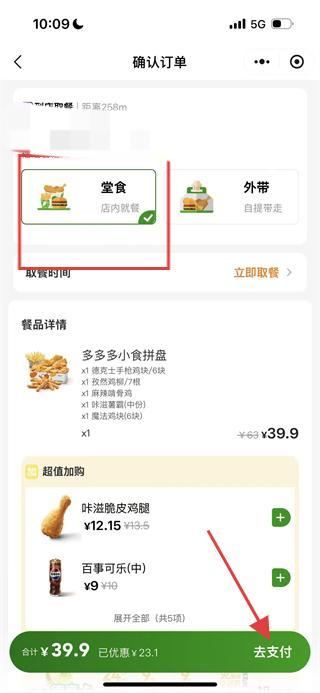 4、在确认订单页面,选择堂食,确认订单信息后点击去支付,完成支付。