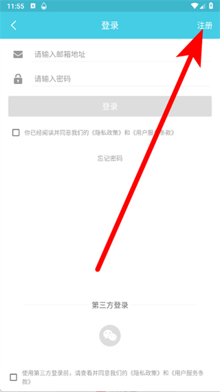 3、进入登录页面后,点击右上角的注册,进入注册页面。