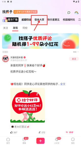 2、在找搭子页面,点击宿舍大赏选项,进入宿舍大赏板块。