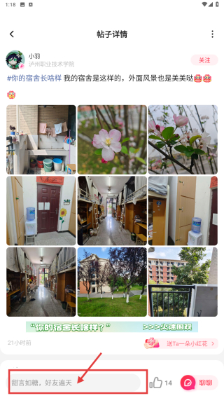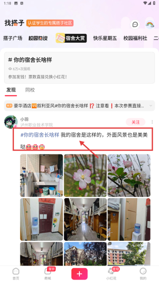 3、在宿舍大赏板块中,选择感兴趣的帖子,例如你的宿舍长啥样我的宿舍是这样的,外面风景也是美美哒,点击进入帖子详情页面。