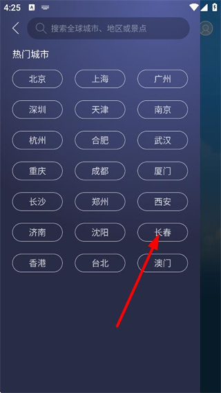 3、在城市选择页面,点击长春,进入长春市天气页面。