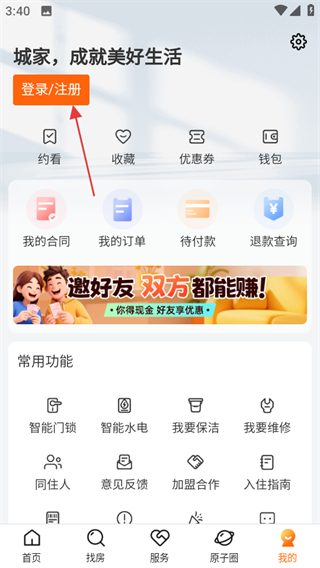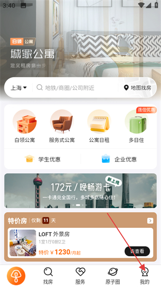 1、进入城家公寓首页,点击底部我的,进入个人页面。