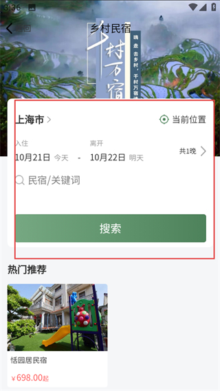 2、在乡村民宿搜索页面,选择信息后,点击搜索,进入民宿列表页面。