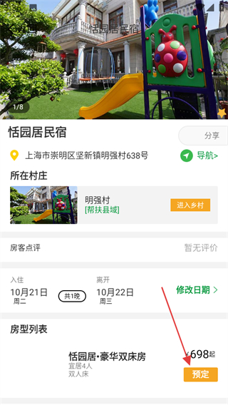 4、在民宿详情页面,选择房型后点击预定,可完成订房操作。