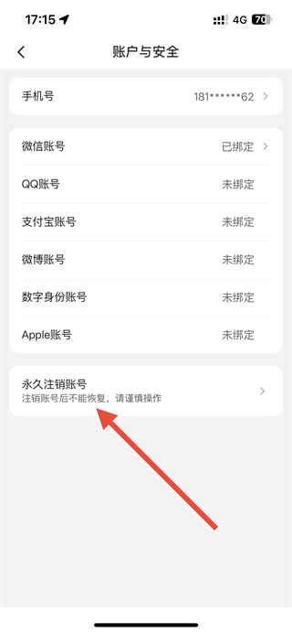 4、在账户与安全页面,点击永久注销账号选项,按照提示操作即可完成账号注销。
