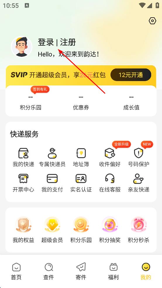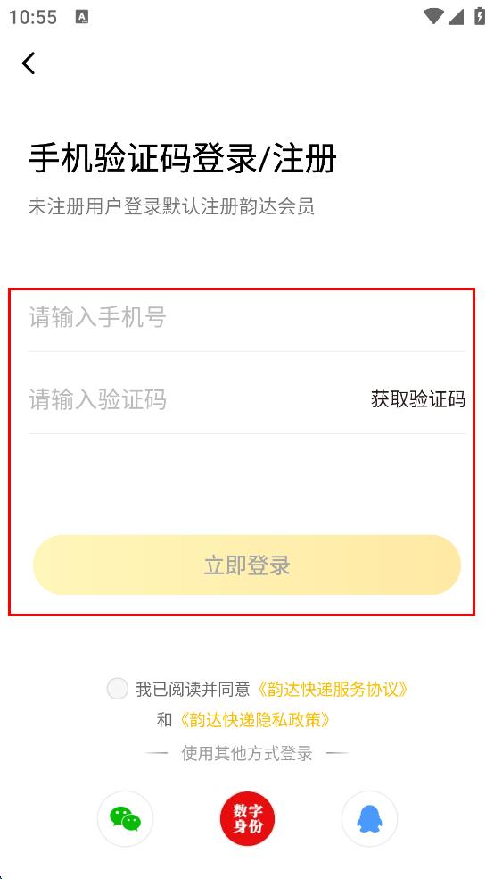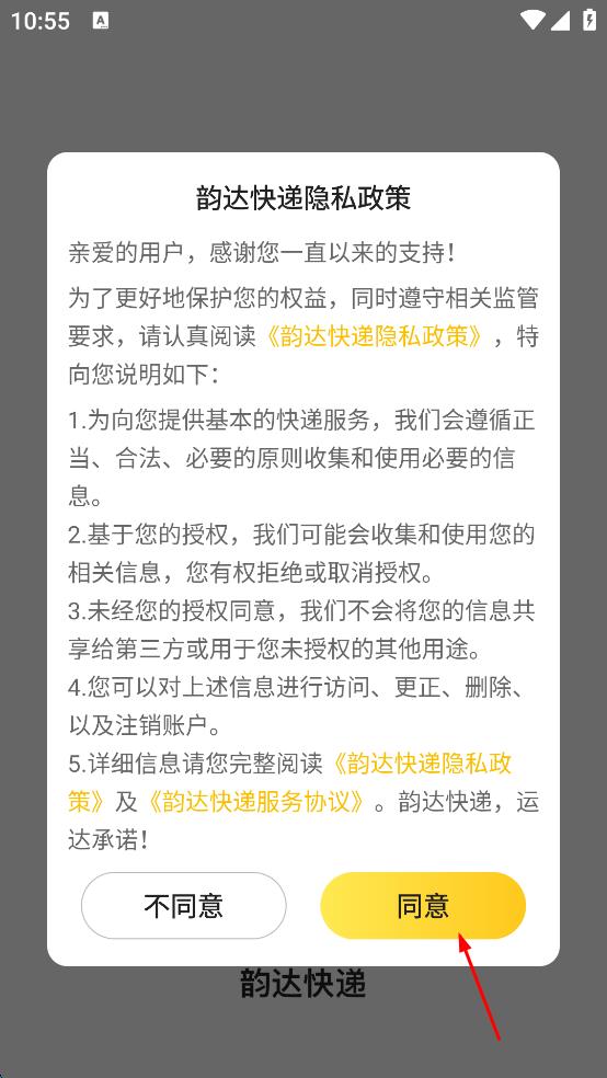 1、打开韵达快递APP,在弹出的韵达快递隐私政策提示框中,点击“同意”按钮。