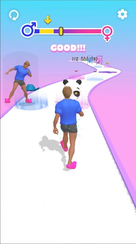 2、赛道中暗藏机关陷阱和性别转换门,需要玩家灵活切换角色属性来应对。例如男性体型可撞碎障碍物,女性体型则能进行灵巧翻转。每个关卡都设有隐藏的性别主题挑战任务;