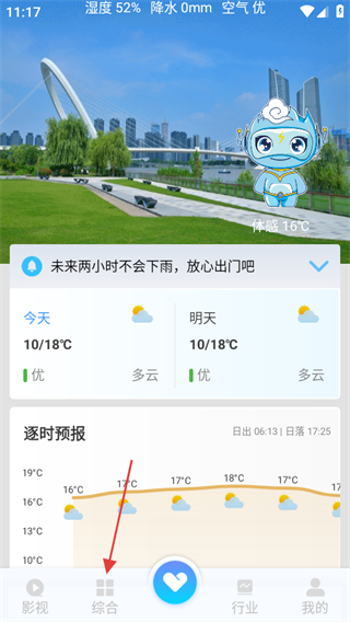1、在江苏天气首页,点击页面底部综合,可进入综合板块。