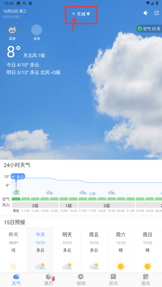 1、打开天气应用,点击顶部+城市选项,进入城市管理页面。