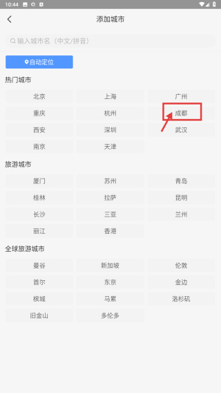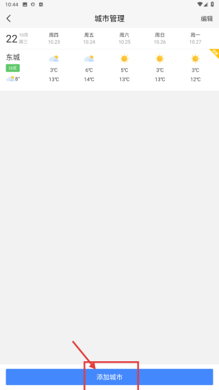 2、在城市管理页面,点击添加城市按钮,进入城市选择界面。